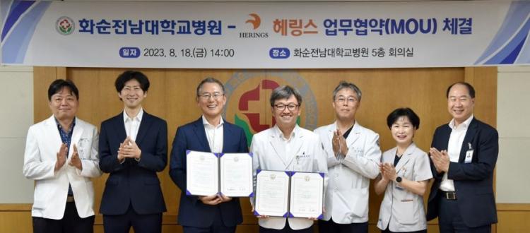 ȼøÀü³²´ëº´¿ø Á¤¿ë¿¬ º´¿øÀå(¿À¸¥ÂÊ¿¡¼ ³× ¹øÂ°)°ú Ç층½º ³²º´È£ ´ëÇ¥(¿ÞÂÊ¿¡¼ ¼¼ ¹øÂ°)°¡ ¾÷¹«Çù¾à¼¿¡ ¼¸í ÈÄ Çù¾àü°á½Ä Âü¼®ÀÚµé°ú ±â³äÃÔ¿µÀ» Çϰí ÀÖ´Ù.