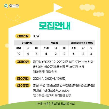 2024³â ȼøÇл翡 ÀÔ»çÇϰíÀÚ ÇÏ´Â ÇлýÀº 19ÀϱîÁö ȼø±º Àα¸Ã»³âÁ¤Ã¥°ú Æò»ý±³À°ÆÀ¿¡ ¹æ¹®¡¤¿ìÆí Á¢¼öÇϰųª e¸ÞÀÏ(sh366@korea.kr)·Î Á¢¼öÇÏ¸é µÈ´Ù.