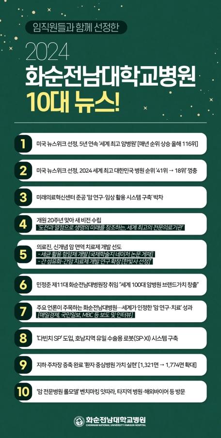 ȼøÀü³²´ëÇб³º´¿ø(º´¿øÀå ¹ÎÁ¤ÁØ)À» ºû³½ ¿Ã ÇÑÇØ 10´ë ´º½º 1À§¿¡ ¹Ì±¹ ´º½ºÀ§Å© ¹ßÇ¥ 5³â ¿¬¼Ó ¡®¼¼°è ÃÖ°í ¾Ïº´¿ø¡¯ ¼±Á¤ÀÌ ²ÅÇû´Ù.
