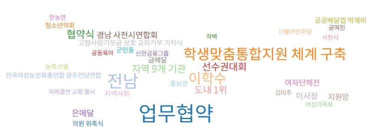 ¿¬°ü¾î´Â ¸ðµÎ 33°³´Ù. °¡ÁßÄ¡¿¡ ±Ù°ÅÇÑ ¿öµå Ŭ¶ó¿ìµå¿¡¼ ´«¿¡ ¶ç´Â ¿¬°ü¾î´Â ¾÷¹«Çù¾à, Áذø½Ä, Àü³², Çлý¸ÂÃãÅëÇÕÁö¿ø ü°è ±¸Ãà, ÀÌÇмö µîÀÌ´Ù. ÇÑÆí, ±â»ç °Ç¼ö¿¡ ±Ù°ÅÇÑ ¿öµå Ŭ¶ó¿ìµå¿¡¼ ´«¿¡ ¶ç´Â ¿¬°ü¾î´Â Àü³², Áö¿ª»çȸ, Àûº®, ¾÷¹«Çù¾à, ±Ý¸Þ´Þ, ³óƯ»ê¹° µîÀÌ´Ù.