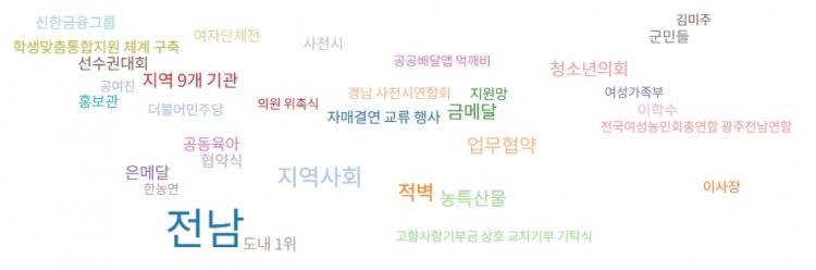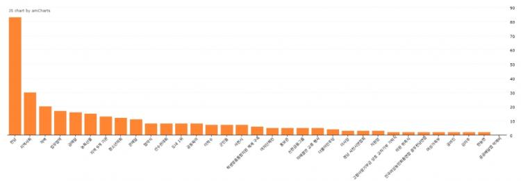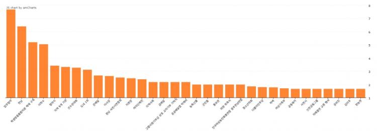 ±â»ç °Ç¼ö¿¡ ±Ù°ÅÇÑ ¸·´ë±×·¡ÇÁ¿¡¼ ÃâÇöºóµµ(ºÐ¼® ±â»ç¿¡¼ ¿¬°ü¾îÀÇ ÃâÇö Ƚ¼ö)°¡ ÀæÀº ¿¬°ü¾î¿Í ±× ºóµµ´Â ³»¸²Â÷¼øÀ¸·Î °¢°¢ Àü³² 83ȸ, Áö¿ª»çȸ 30ȸ, Àûº® 20ȸ, ¾÷¹«Çù¾à 17ȸ, ±Ý¸Þ´Þ 16ȸ, ³óƯ»ê¹° 15ȸ µîÀÌ´Ù. ¿¬°ü¾î 33°³ÀÇ ÃÑ ÃâÇöºóµµ´Â 323ȸÀÌ´Ù.