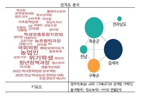 Áö³ 7¿ù ȼø ´º½º¿¡¼ ¿¬°á°ü°è¸¦ º¸¿©ÁÖ´Â ±×¸²¿¡ ³ªÅ¸³ ¿¬°ü¾î´Â 5°³´Ù. ±×Áß °Ë»ö¾î´Â (ȼø) AND ("±¸º¹±Ô"), Àι°Àº ±¸º¹±Ô, Àå¼Ò´Â ȼø±º, Àü³², Àü¶ó³²µµ µîÀÌ´Ù. ÇÑÆí, ´«¿¡ ¶ç´Â Ű¿öµå´Â ³ó¾÷ÀÎ, À§±âÇлý, û³âÁ¤Ã¥°úÀå, ±¹È¸ÀÇ¿ø, Çлý¸ÂÃãÅëÇÕÁö¿ø¹ý, ³óÃÌȰ·Â°úÀå µîÀÌ´Ù.