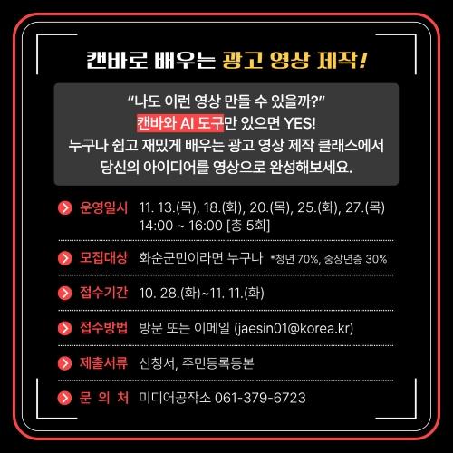 ±³À° ÀÏÁ¤Àº 11¿ù 13ÀÏ(¸ñ)ºÎÅÍ 27ÀÏ(¸ñ)±îÁö ÃÑ 5ȸ¿¡ °ÉÃÄ ¿ÀÈÄ 2½ÃºÎÅÍ 4½Ã±îÁö ÁøÇàµÇ¸ç, ±³À°»ýµéÀº ¹è¿î ³»¿ëÀ» ¹ÙÅÁÀ¸·Î È«º¸³ª SNS ÄÜÅÙÃ÷ Á¦ÀÛ¿¡ ¹Ù·Î Ȱ¿ëÇÒ ¼ö ÀÖ´Â ½Ç¹« ¿ª·®À» ÀÍÈ÷°Ô µÈ´Ù.