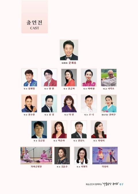 ȼø Ãâ½Å °¡¼öµéÀÌ ¹«´ë¿¡ ¿À¸£´Â ¡®°¡À»À½¾Ç ÄܼƮ¡¯°¡ ¿À´Â 15ÀÏ ÇÏ´Ï¿ò¹®È½ºÆ÷Ã÷¼¾ÅÍ ¸¸¿¬È¦¿¡¼ ¿¸°´Ù. (»ç)Çѱ¹¿¬¿¹¿¹¼úÀÎÃÑ¿¬ÇÕȸ ȼøÁöȸ°¡ ÁÖÃÖÇÏ´Â À̹ø °ø¿¬Àº ±º¹Î°ú ÇÔ²² ¼ÒÅëÇϰí Áñ±â´Â À½¾ÇÃàÁ¦·Î ²Ù¸çÁú ¿¹Á¤ÀÌ´Ù.