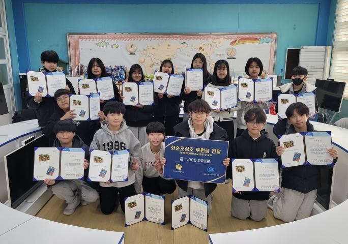 ȼø¿À¼ºÃʵîÇб³(±³Àå ½Å¿ëȸ) 2030¹Ì³×¸£¹Ù±³½Ç ÇлýµéÀÌ Áö³ 1³â°£ ´Ù¾çÇÑ ±³À°È°µ¿À» ÅëÇØ ¹ÞÀº »ó±ÝÀ» Â÷°îÂ÷°î ¸ð¾Æ, Áö³ 12¿ù 24ÀÏ ±¹Á¦¹é½Å¿¬±¸¼Ò¿¡ 100¸¸ ¿øÀÇ ÈÄ¿ø±ÝÀ» Á÷Á¢ Àü´ÞÇß´Ù.