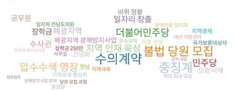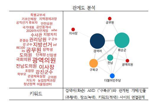 Áö³ 12¿ù ȼø ´º½º¿¡¼ ¿¬°á°ü°è¸¦ º¸¿©ÁÖ´Â ±×¸²¿¡ ³ªÅ¸³ ¿¬°ü¾î´Â 8°³´Ù. ±×Áß °Ë»ö¾î´Â (ȼø) AND ("±¸º¹±Ô"), Àι°Àº ±¸º¹±Ô, Àå¼Ò´Â ȼø±º, Àü³² µîÀÌ´Ù. ±â°üÀº ´õºÒ¾î¹ÎÁÖ´çÀÌ´Ù. ÇÑÆí, ´«¿¡ ¶ç´Â Ű¿öµå´Â ±¤¿ªÀÇ¿ø, °ø¹«¿ø, ÀÌ»çÀå µîÀÌ´Ù.