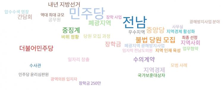 ¿¬°ü¾î ºÐ¼®À» º¸¿©ÁÖ´Â ¸·´ë±×·¡ÇÁ¿¡¼ °¡ÁßÄ¡·Î º¸³ª ±â»ç °Ç¼ö·Î º¸¾Æ »óÀ§¸¦ Â÷ÁöÇÑ ¿¬°ü¾î´Â Áß¡°è, ºÒ¹ý ´ç¿ø ¸ðÁý µîÀÌ´Ù. ±× ¿¬°ü¾îÀÇ °¡ÁßÄ¡´Â °¢°¢ 7.06, 6.88À̰í, ÃâÇöºóµµ´Â °¢°¢ 28ȸ, 32ȸÀÌ´Ù.