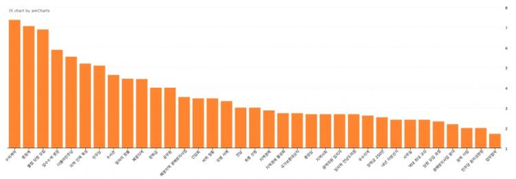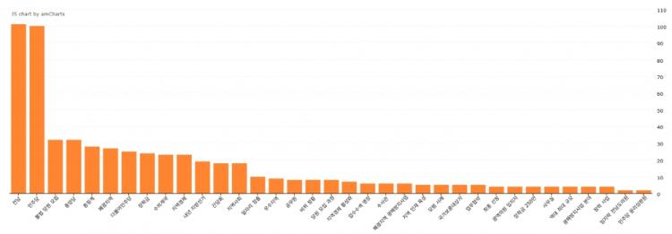 ±â»ç °Ç¼ö¿¡ ±Ù°ÅÇÑ ¸·´ë±×·¡ÇÁ¿¡¼ ÃâÇöºóµµ(ºÐ¼® ±â»ç¿¡¼ ¿¬°ü¾îÀÇ ÃâÇö Ƚ¼ö)°¡ ÀæÀº ¿¬°ü¾î¿Í ±× ºóµµ´Â ³»¸²Â÷¼øÀ¸·Î °¢°¢ Àü³² 101ȸ, ¹ÎÁÖ´ç 100ȸ, ºÒ¹ý ´ç¿ø ¸ðÁý 32ȸ Áß¾Ó´ç 32ȸ, Áß¡°è 28ȸ, Æó±¤Áö¿ª 27ȸ, ´õºÒ¾î¹ÎÁÖ´ç 25ȸ µîÀÌ´Ù. ¿¬°ü¾î 35°³ÀÇ ÃÑ ÃâÇöºóµµ´Â 590ȸ´Ù.