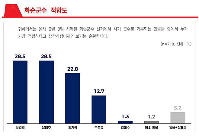 Â÷±â ȼø±º¼ö ÀûÇÕµµ Á¶»ç¿¡¼´Â À±¿µ¹Î Àü ºÎÀÇÀå°ú ¹®ÇàÁÖ Àü µµÀÇ¿øÀÌ ¼Ò¼öÁ¡ ÀÚ¸®±îÁö µ¿ÀÏÇÑ 28.5%¸¦ ±â·ÏÇß´Ù. ÀÓÁö¶ô µµÀÇ¿ø ¶ÇÇÑ 22.8%ÀÇ ÁöÁöÀ²À» º¸¿´´Ù. ±¸º¹±Ô ȼø±º¼ö´Â 12.7%, ±èȸ¼ö Æ÷ÇÁ¸® ´ëÇ¥´Â 1.3%ÀÇ ÁöÁöÀ²À» º¸¿´´Ù.