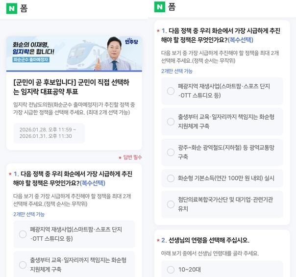ÀÓÁö¶ô µµÀÇ¿øÀº À̹ø ´ëÇ¥°ø¾à ¿Â¶óÀÎ ¼³¹®Àº ¿À´Â 1¿ù 31ÀÏ ÀÚÁ¤±îÁö À̾îÁö¸ç, ȼø±º¹ÎÀº ÃÖ±Ù Áö¿ª¿¡¼ ȸÀڵǰí ÀÖ´Â 5°¡Áö Á¤Ã¥ Áß °¡Àå ½Ã±ÞÇÑ Á¤Ã¥ 2°¡Áö¸¦ ¼±ÅÃÇÒ ¼ö ÀÖ´Ù. ¿Â¶óÀÎ ¼³¹®¿¡ ¾ð±ÞµÈ 5°¡Áö Á¤Ã¥Àº ¡®±¤ÁÖ~ȼø ±¤¿ªÃ¶µµ(ÁöÇÏö) µî ±¤¿ª±³Åë¸Á ±¸Ã࡯, ¡®È¼øÇü ±âº»¼Òµæ(¿¬°£ 100¸¸ ¿ø ³»¿Ü) ½Ç½Ã¡¯, ¡®Ãâ»ýºÎÅÍ ±³À°¡¤ÀÏÀÚ¸®±îÁö Ã¥ÀÓÁö´Â ȼøÇü Áö¿øÃ¼°è ±¸Ã࡯, ¡®Æó±¤Áö¿ª Àç»ý»ç¾÷(½º¸¶Æ®ÆÊ¡¤½ºÆ÷Ã÷ ´ÜÁö¡¤OTT ½ºÆ©µð¿À µî)¡¯, ¡®Ã·´ÜÀǷẹÇÕ±¹°¡»ê´Ü ¹× ´ë±â¾÷¡¤°ü·Ã±â°ü À¯Ä¡¡¯ µîÀÌ´Ù.