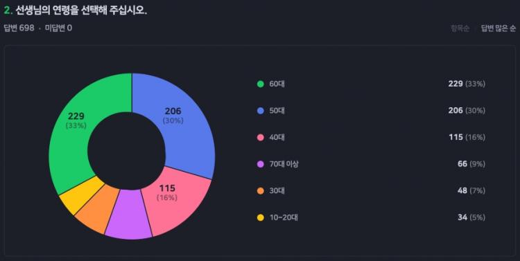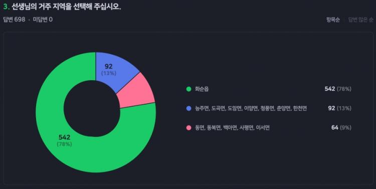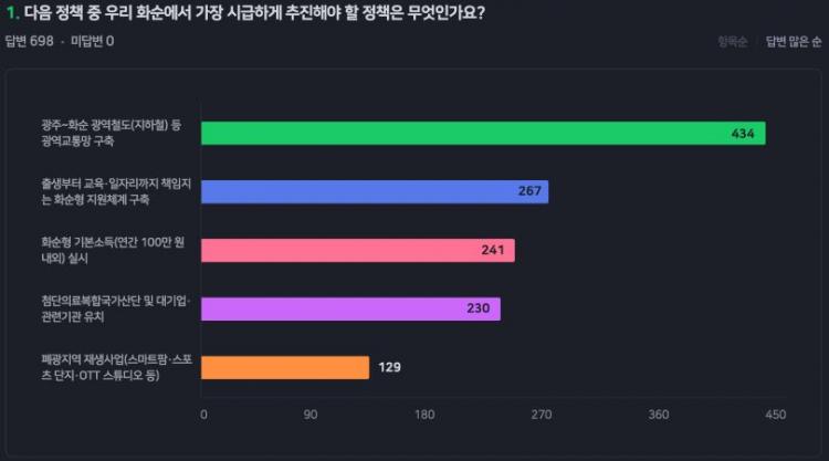 ÀÓ ÀÇ¿ø Ãø¿¡ µû¸£¸é À̹ø ¼³¹®¿¡´Â ÃÑ 746°ÇÀÇ ÀÀ´äÀÌ Á¢¼öµÆÀ¸¸ç, ÀÌ °¡¿îµ¥ ¹«È¿¡¤Áߺ¹ ÀÀ´ä 48°ÇÀ» Á¦¿ÜÇÑ 698°ÇÀÌ À¯È¿ ÀÀ´äÀ¸·Î Áý°èµÆ´Ù. À¯È¿ ÀÀ´ä Áß ±¤ÁÖ~ȼø ±¤¿ªÃ¶µµ(ÁöÇÏö) À¯Ä¡°¡ 434°ÇÀ¸·Î °¡Àå ¸¹Àº ¼±ÅÃÀ» ¹Þ¾Æ 1À§¸¦ Â÷ÁöÇß´Ù.