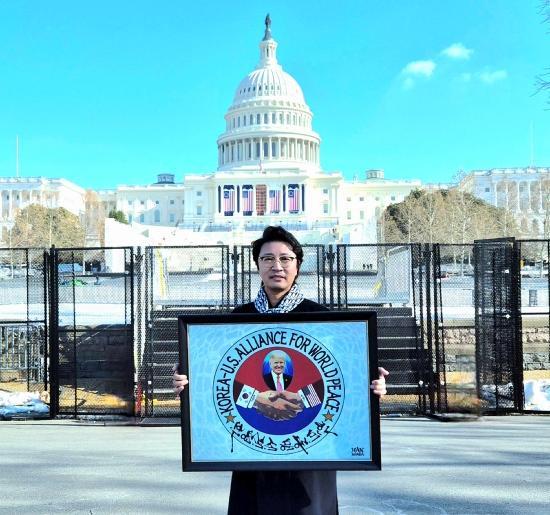 ÇÑÇѱ¹ ¼¼°èÆòÈÀÛ°¡°¡ ¹Ì±¹ ¿ö½ÌÅÏD.C. ÀÇȸÀÇ»ç´ç ¾Õ¿¡¼ Çѹ̵¿¸Í ¼¼°èÆòÈ ÀÛǰÀ» µé°í ÆÛÆ÷¸Õ½º¸¦ Çϰí ÀÖ´Ù.(»çÁøÁ¦°ø: ÇÑÇѱ¹ ÀÛ°¡)