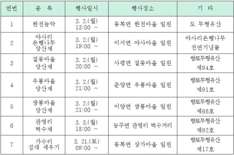 ÀüÅë ¹Î¼ÓÇà»ç´Â ȼø±º °ü³» 7°³ÀÇ ¸é¿¡¼ °¢°¢ °³ÃֵǸç, Çà»ç Á¾¸ñ°ú °³ÃÖ ³¯Â¥ µî ¼¼ºÎ ³»¿ëÀº ¾Æ·¡ Ç¥¸¦ Âü°íÇÏ¸é µÈ´Ù.