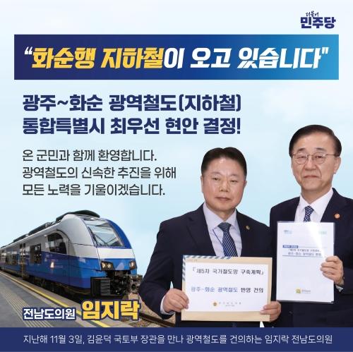 ÇÑÆí, ȼø±º¼ö Ã⸶¿¹Á¤ÀÚÀÎ ÀÓ ÀÇ¿øÀº Áö³ÇØ 11¿ù 3ÀÏ ±èÀ±´ö ±¹Åä±³ÅëºÎ Àå°üÀ» ¸¸³ª ±¤ÁÖ~ȼø ±¤¿ªÃ¶µµ(ÁöÇÏö)¸¦ Á¦5Â÷ ±¹°¡Ã¶µµ¸Á ±¸Ãà°èȹ¿¡ ¹Ý¿µÇØ ÁÙ °ÍÀ» °ÇÀÇÇÏ¿´°í, Áö³´Þ 2ÀÏ¿¡´Â ±¤ÁÖ~ȼø ±¤¿ªÃ¶µµ¿Í ±¤¿ª±³Åë¸Á ±¸ÃàÀ» ´ëÇ¥°ø¾à(Á¦1°ø¾à)À¸·Î ¼±Á¤Çϰí ÃÖ¿ì¼± °úÁ¦·Î ÃßÁøÇÒ °ÍÀ» ¹àÇô¿À´Â µî ±¤¿ªÃ¶µµ ÃßÁø¿¡ ¸ÅÁøÇؿԴÙ. ±×¸®ÇÏ¿© Áö³´Þ 24ÀÏ Àü¶ó³²µµ´Â Ưº°½Ã ÃÖ¿ì¼± Çö¾ÈÀ¸·Î ±¤ÁÖ~ȼø ±¤¿ªÃ¶µµ¸¦ °áÁ¤ÇÏ¿´´Ù.