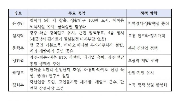 ¶ÇÇÑ À̹ø ¼±°Å¿¡¼ °¡Àå Áß¿äÇÑ ¹Ì·¡ º¯¼ö·Î ¶°¿À¸¥ ±¤ÁÖ¿Í Àü³²ÀÇ ÇàÁ¤ ÅëÇÕ¿¡ ´ëÇÑ Ã⸶ ¿¹Á¤ÀÚµéÀÇ °ø¾àÀ» º¸¸é ±¤ÁÖ¡¤Àü³² ÅëÇÕ ÀÌÈÄ È¼øÀÇ Àå±â Àü·«À» ±¸Ã¼ÀûÀ¸·Î Á¦½ÃÇÑ Á¤Ã¥Àº °ÅÀÇ º¸ÀÌÁö ¾Ê´Â´Ù.
