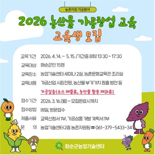 ȼø±º(±º¼ö ±¸º¹±Ô)Àº ³ó»ê¹° °¡°ø ºÐ¾ß â¾÷ ¿ª·®À» ³ôÀÌ°í ³ó°¡ ¼Òµæ Áõ´ë¸¦ µµ¸ðÇϱâ À§ÇØ ¡®2026 ³ó»ê¹° °¡°øÃ¢¾÷ ±³À°¡¯À» ½Ç½Ã´Ù°í ¹àÇû´Ù.