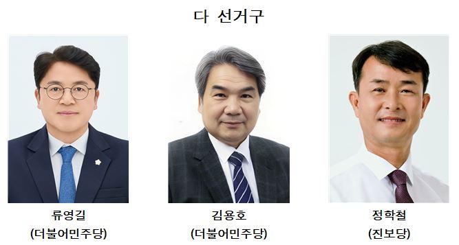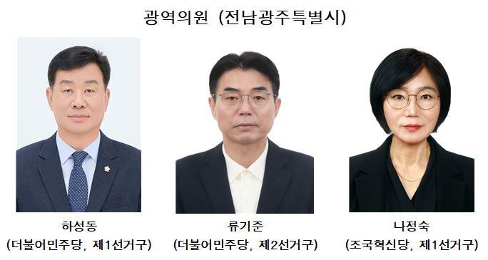 Àü³²±¤ÁÖÆ¯º°½ÃÀÇ¿ø ¼±°Å ¿ª½Ã ´ëÁøÇ¥°¡ È®Á¤µÆ´Ù. Á¦1¼±°Å±¸¿¡¼´Â ´õºÒ¾î¹ÎÁÖ´ç Çϼºµ¿ È帰¡ °æ¼±À» Åë°úÇßÀ¸¸ç, Á¶±¹Çõ½Å´ç¿¡¼´Â ³ªÁ¤¼÷ È帰¡ Ãâ»çÇ¥¸¦ ´øÁ³´Ù. Á¦2¼±°Å±¸´Â Çö Àü³²µµÀÇ¿øÀÎ ·ù±âÁØ È帰¡ °øÃµÀ» È®Á¤Çϸç Àç¼±¿¡ µµÀüÇÑ´Ù.