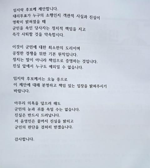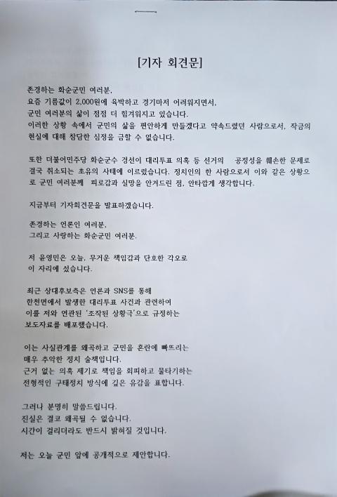 ´õºÒ¾î¹ÎÁÖ´ç ȼø±º¼ö ¿¹ºñÈĺ¸ À±¿µ¹ÎÀÌ 17ÀÏ ¼±°Å»ç¹«½Ç¿¡¼ ±âÀÚȸ°ßÀ» ¿°í ÃÖ±Ù ºÒ°ÅÁø ´ë¸®ÅõÇ¥ ÀÇȤ°ú °ü·ÃÇØ °°æ ´ëÀÀ ÀÔÀåÀ» ¹àÇû´Ù.